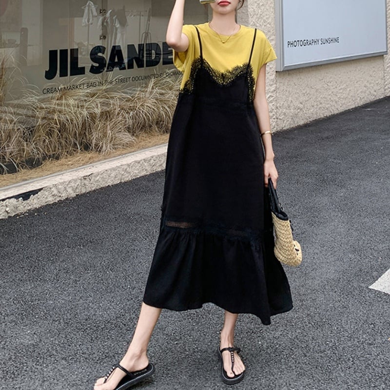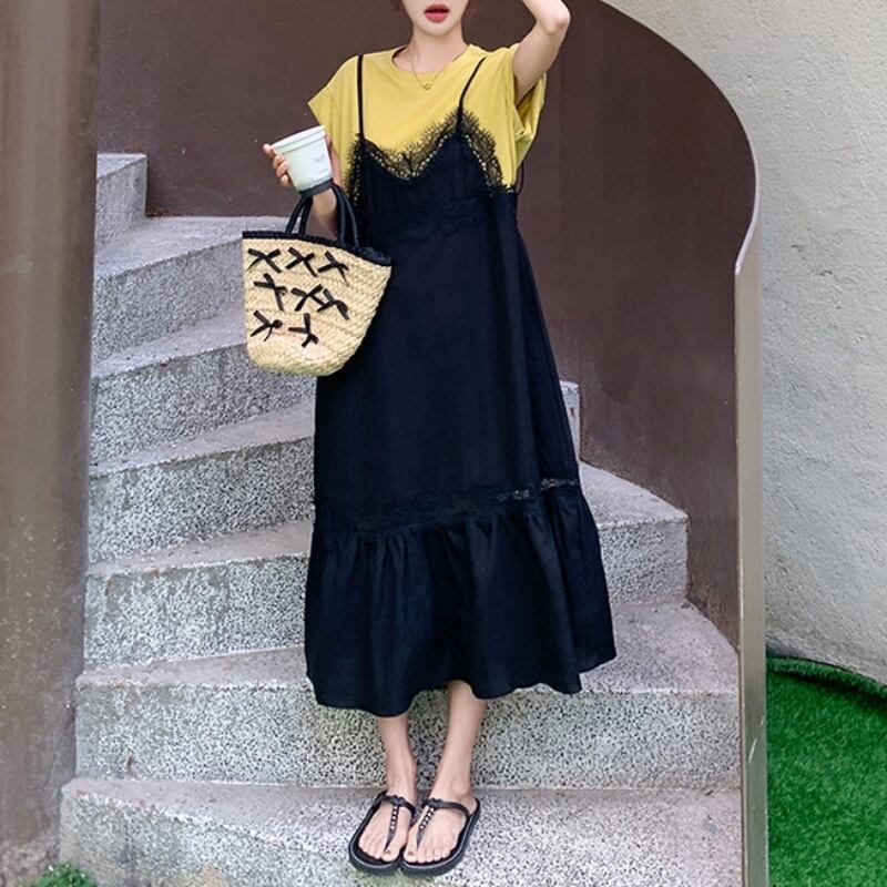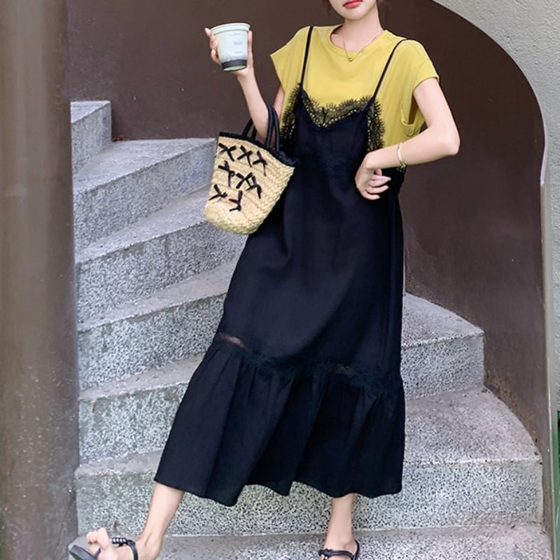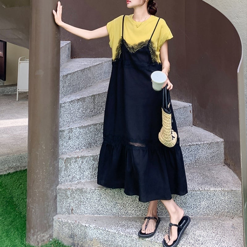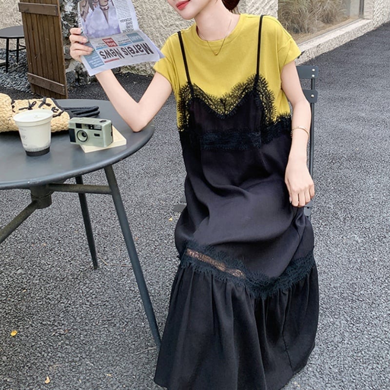 150cm〜 シンプルTシャツトップス + レースキャミソールワンピース