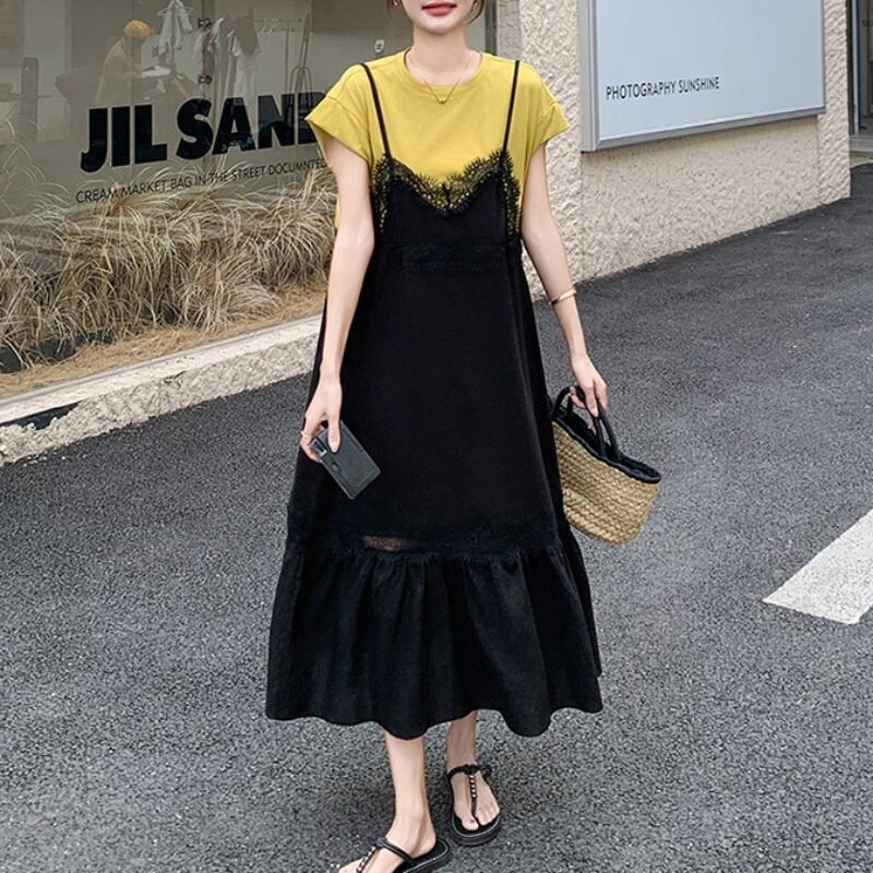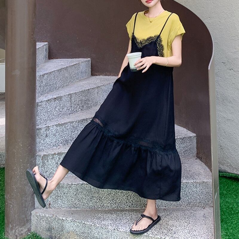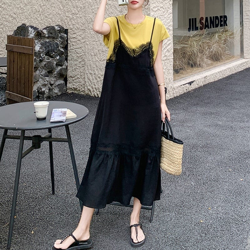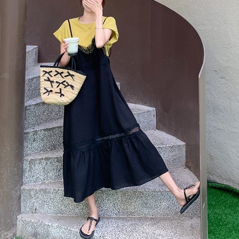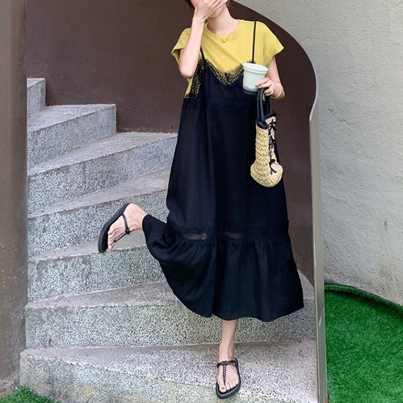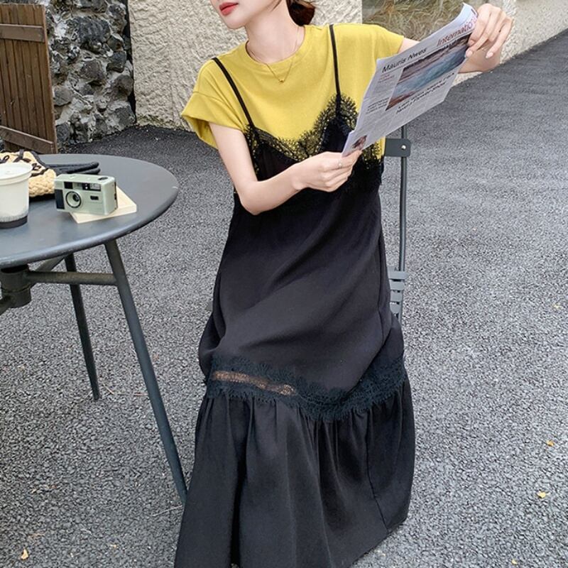 150cm〜 シンプルTシャツトップス + レースキャミソールワンピース
