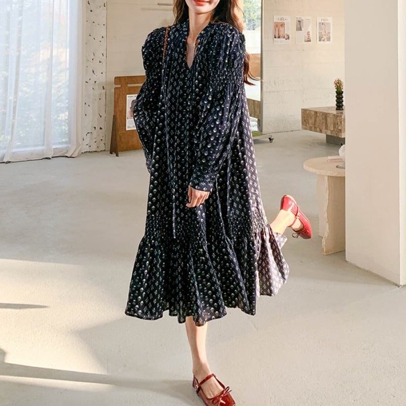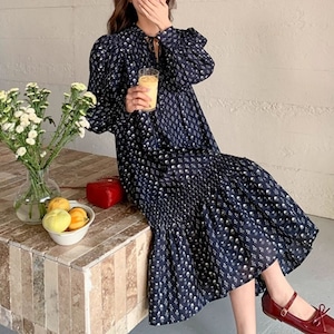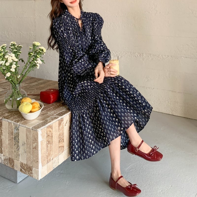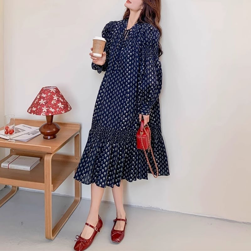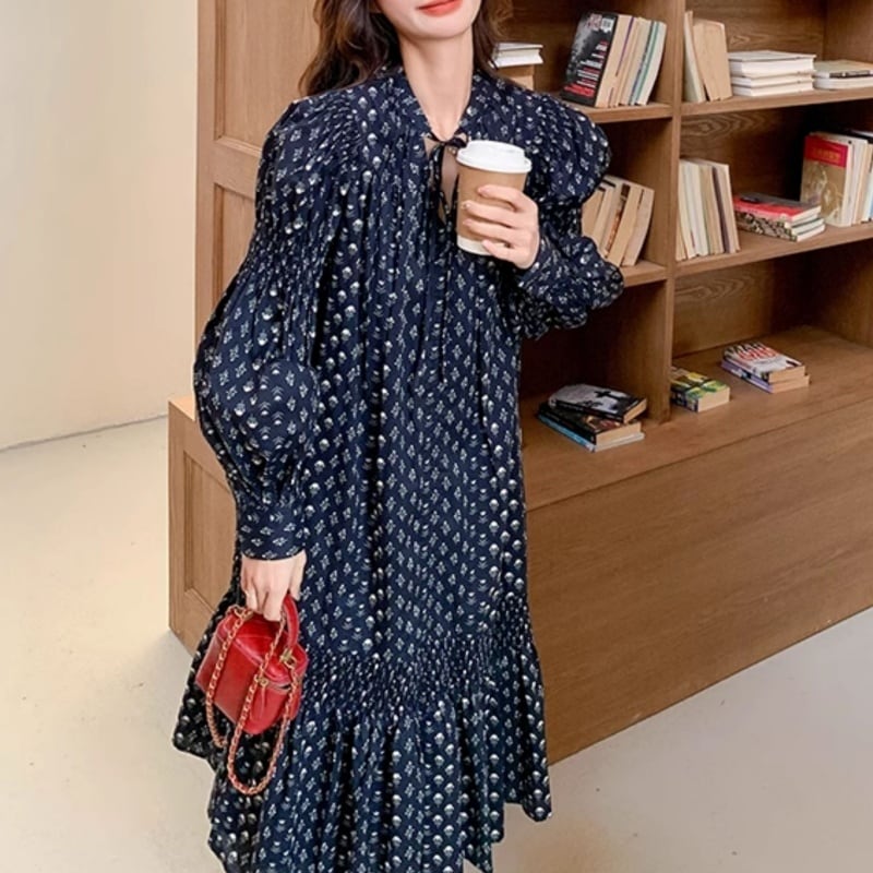 145cm〜 ネイビーブルーフレンチフローラルワンピース