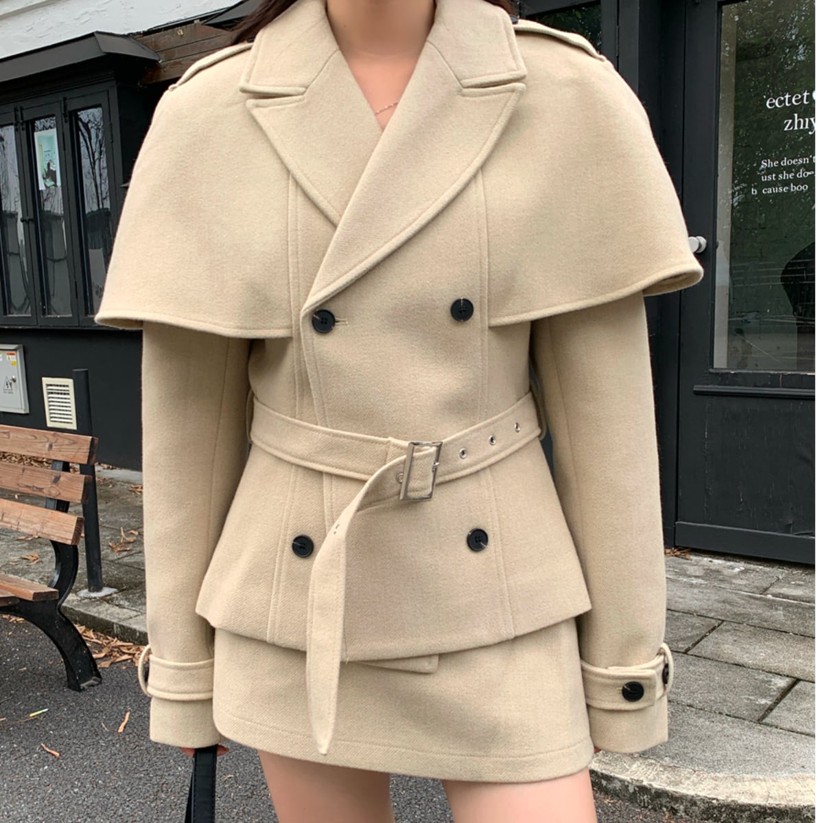 150cm〜 ケープ風パッド入りウールスカートツーピースセット