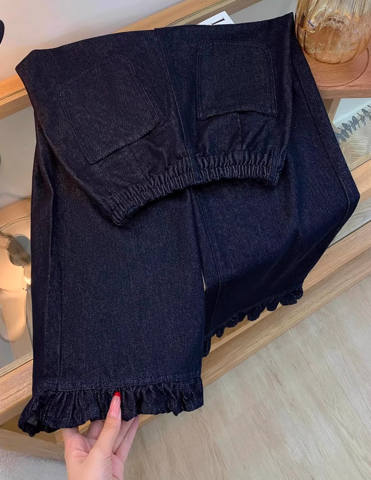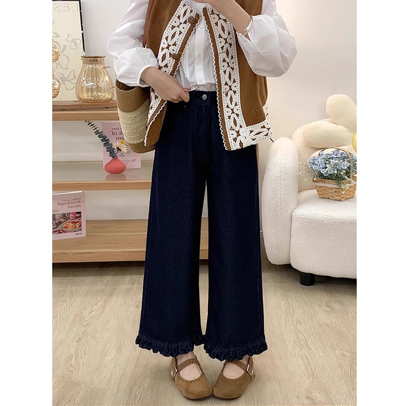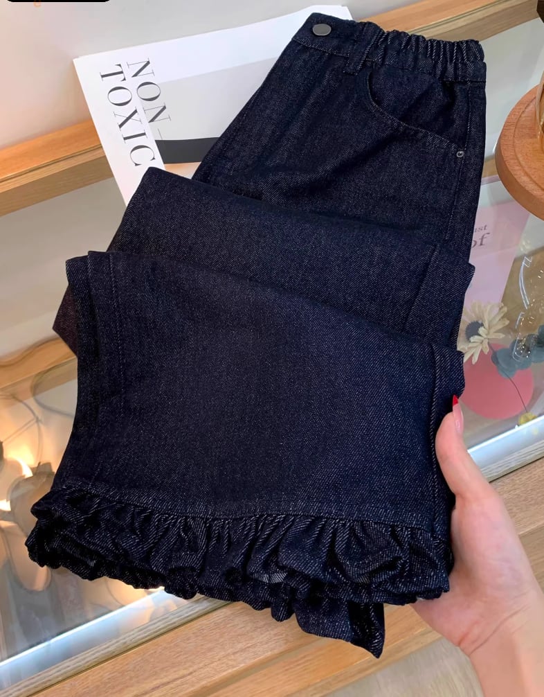 140cm〜 フリルレトロデニムブルークロップドジーンズ