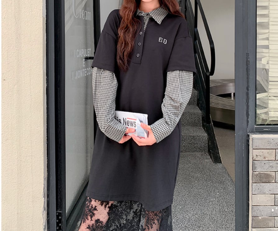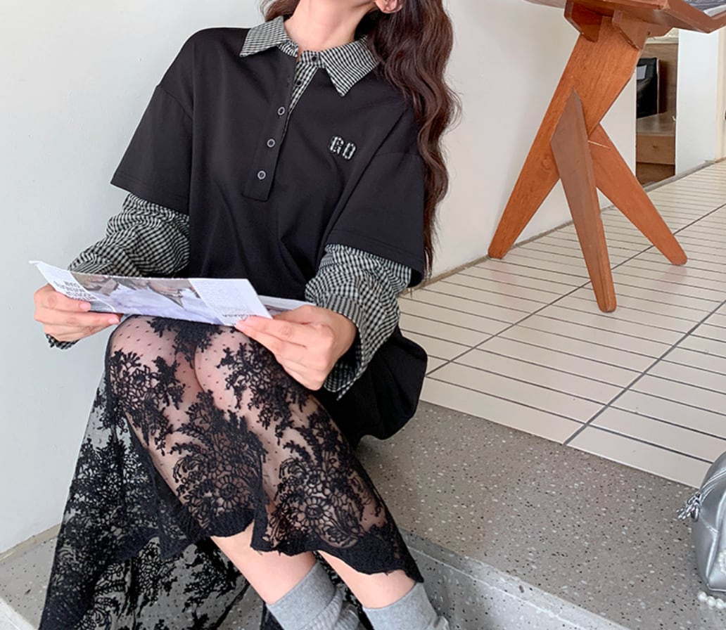 150cm〜 コリアンチックリラックスレースポロカラーツーピース