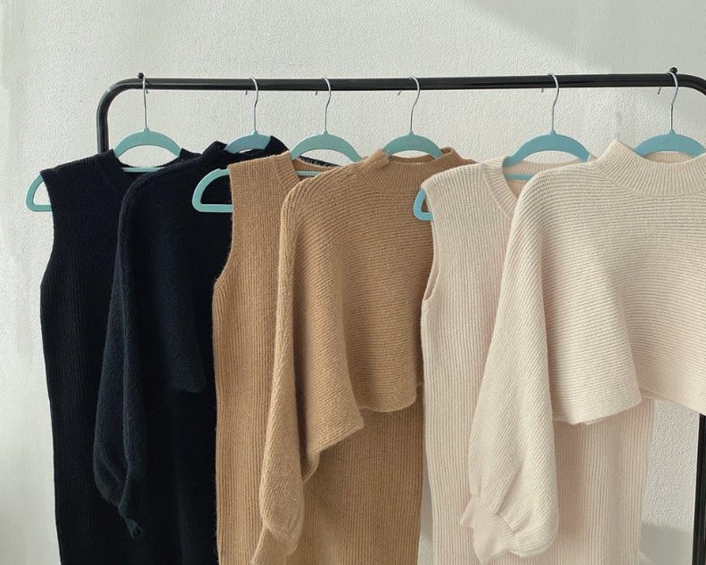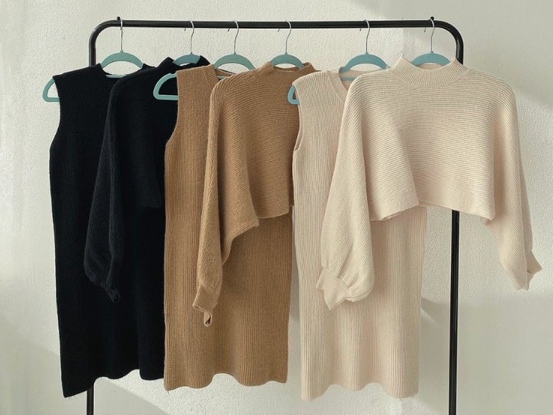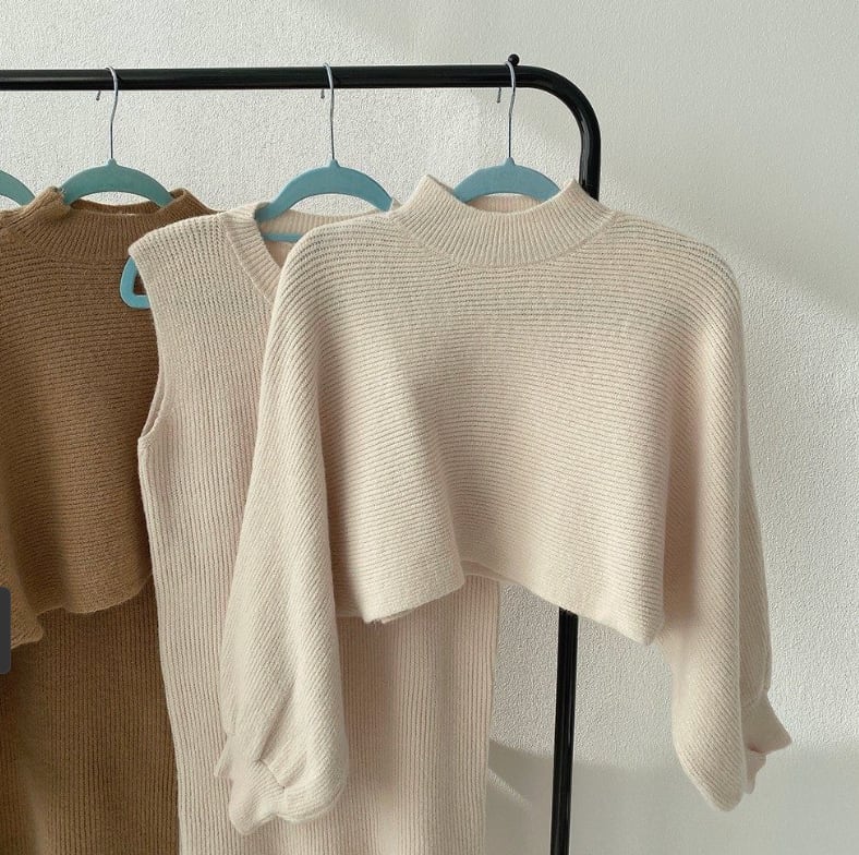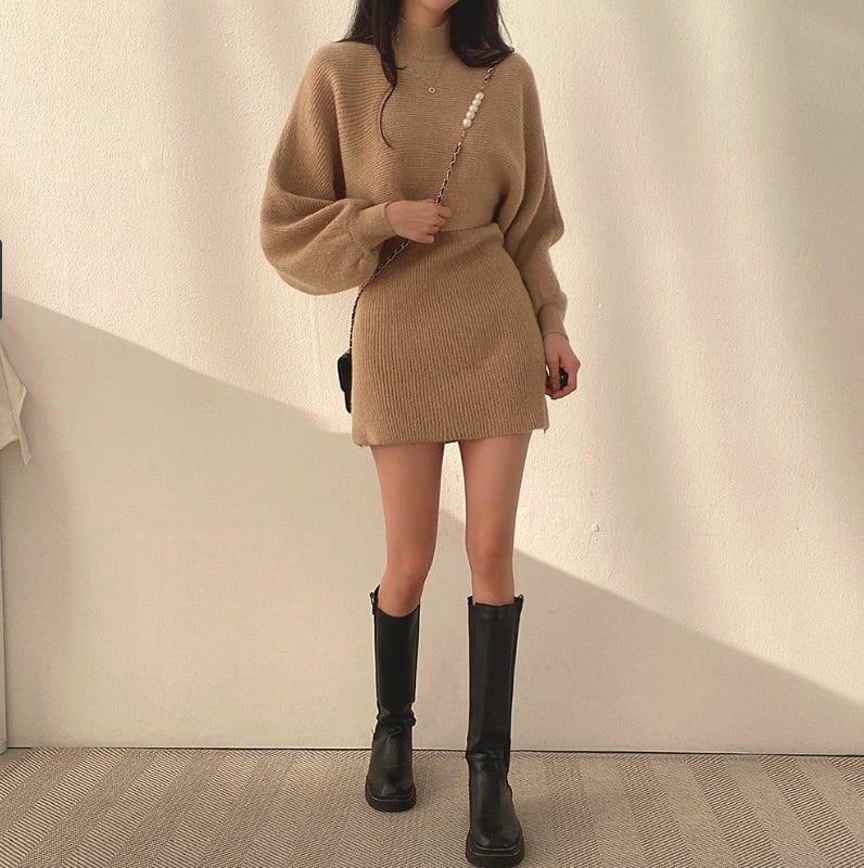 150cm〜 コリアンシックハイネックランタンスリーブニットセーター+ショートドレススーツ