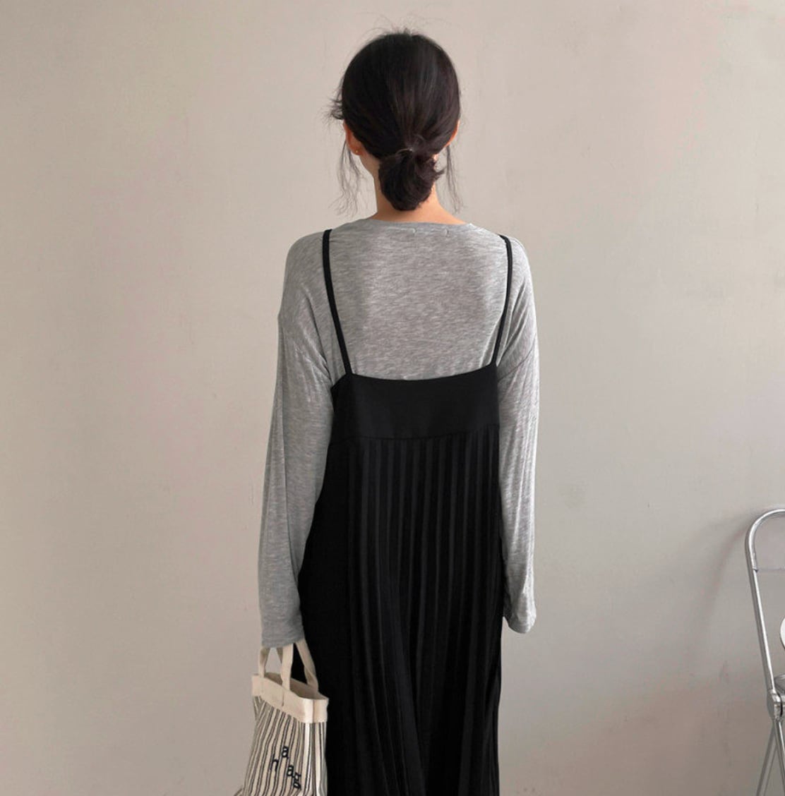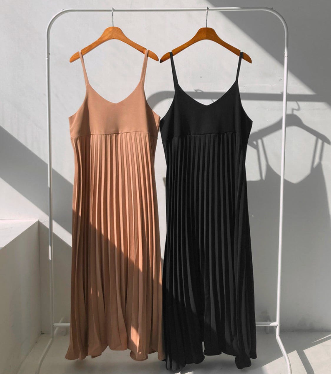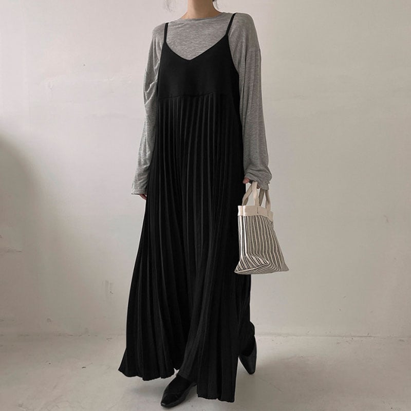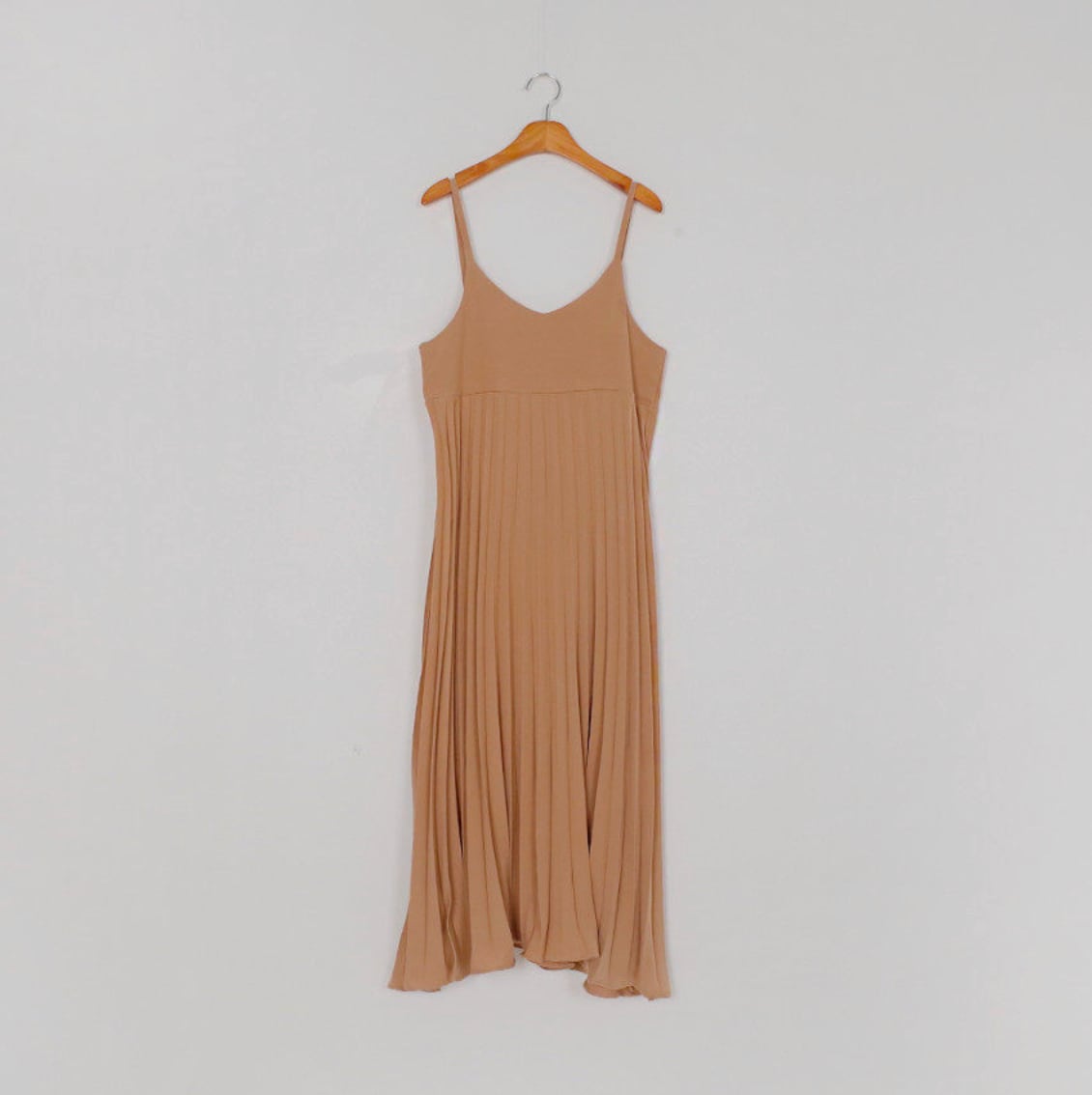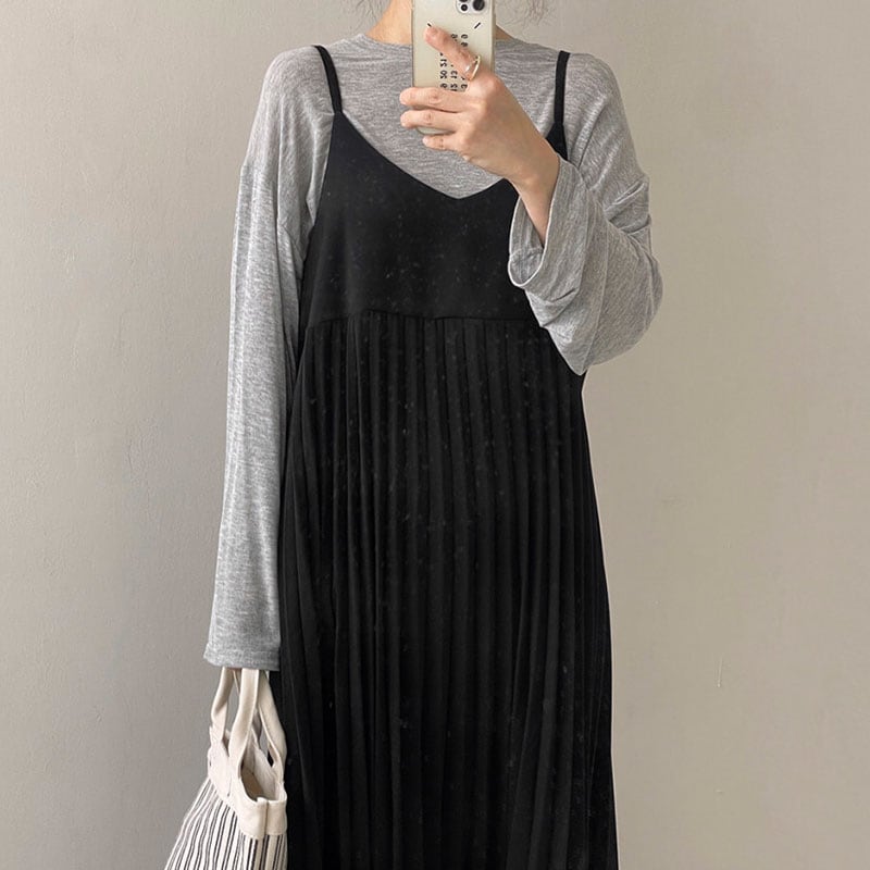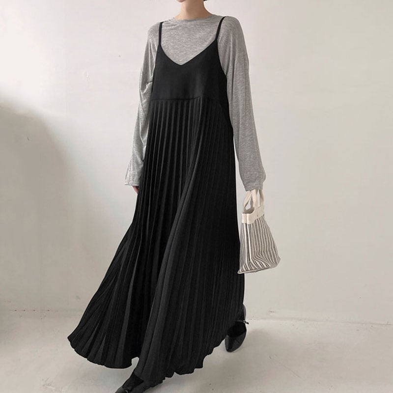 147cm〜 レトロシンプルVネックプリーツノースリーブストラップドレス