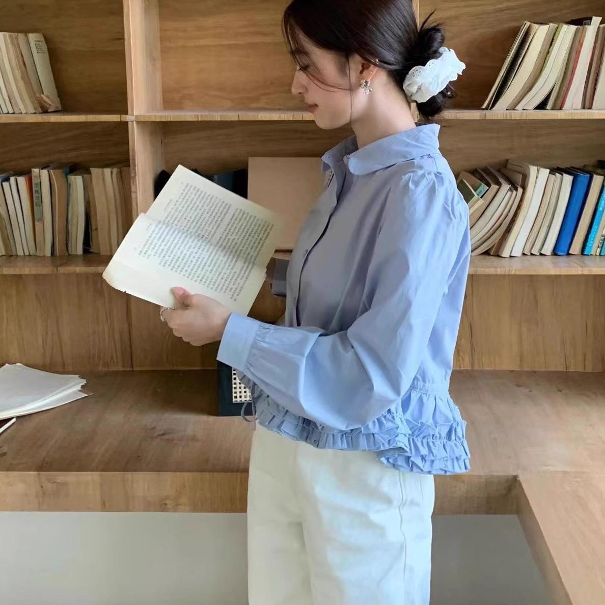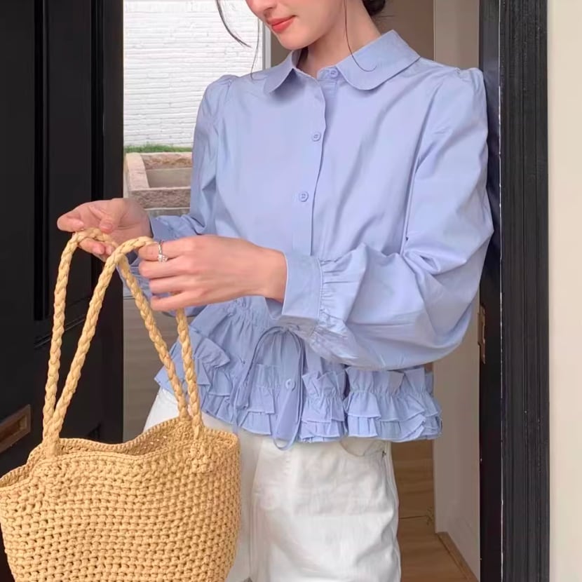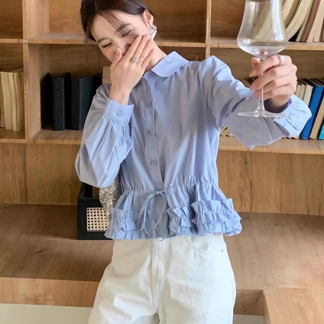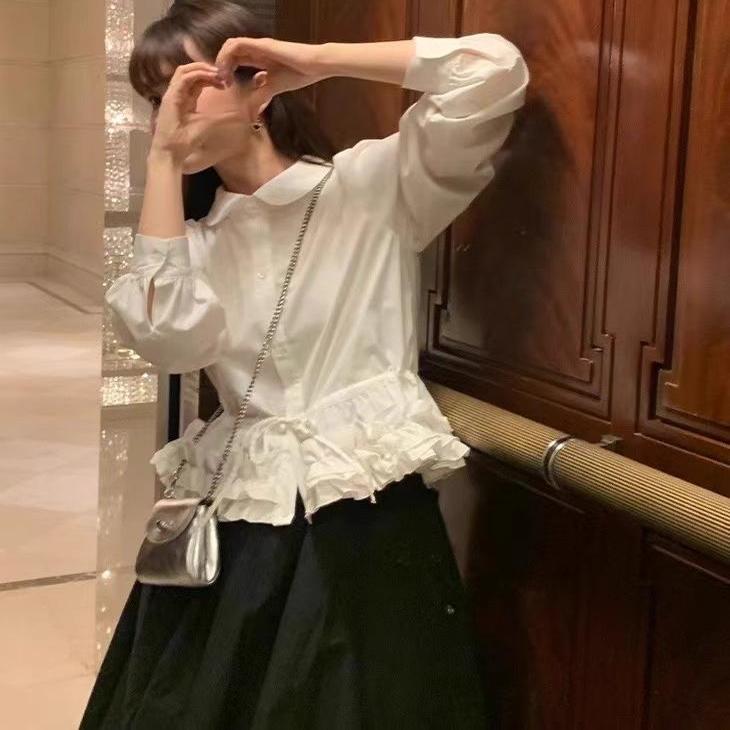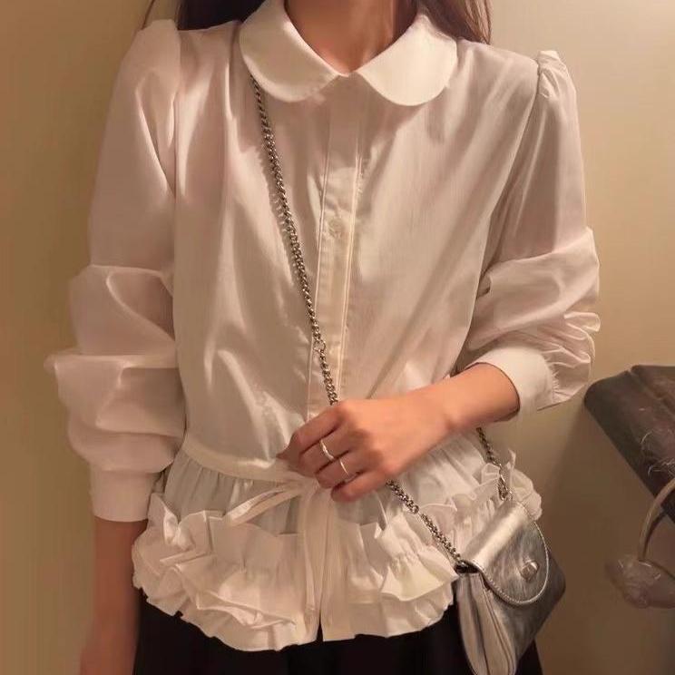 デザイン裾レースドールカラー長袖シャツ