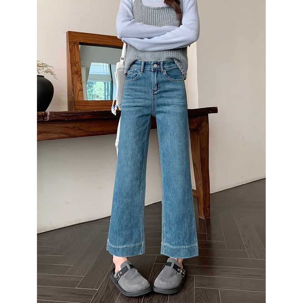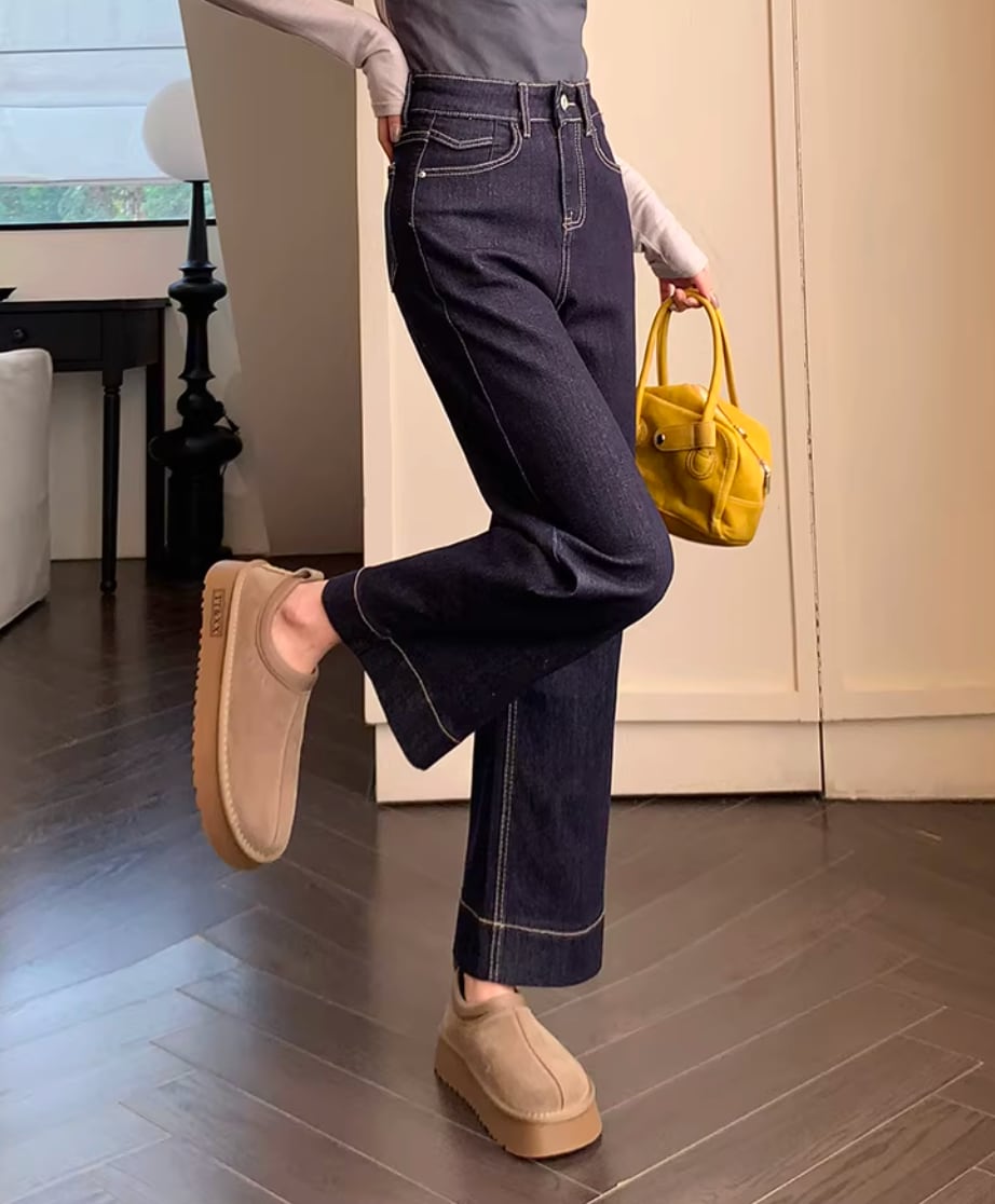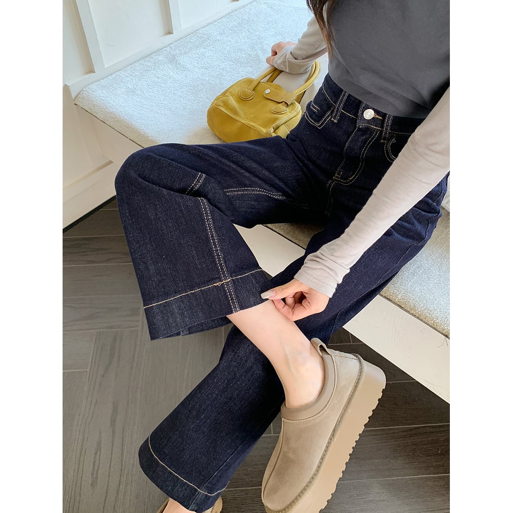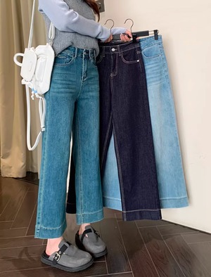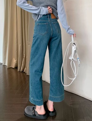149cm〜 韓国風ハイウエストストレッチストレートジーンズ
