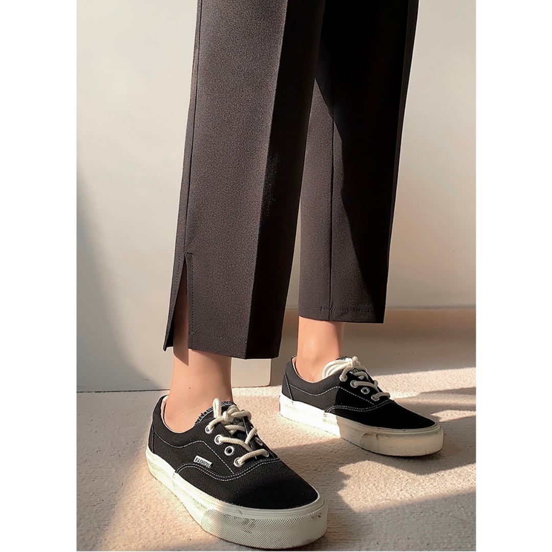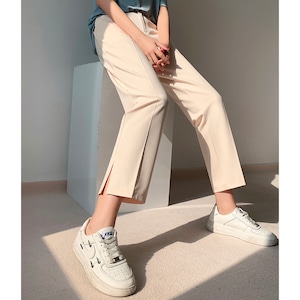 スリット入りの裾で足首を見せ、細見え効果も抜群。