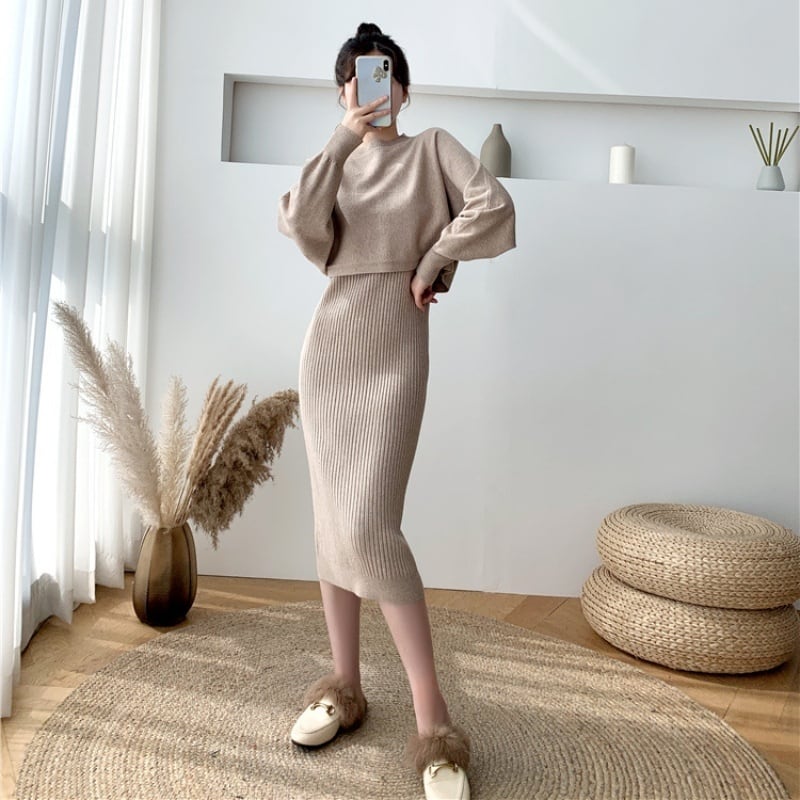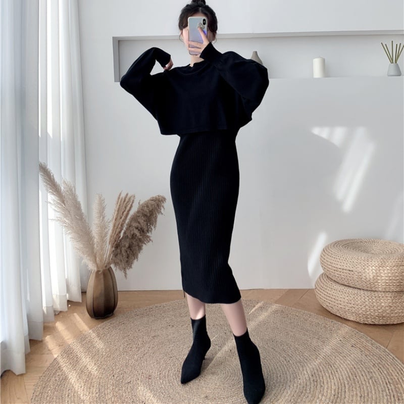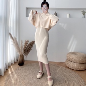 スタイリッシュなツーピースリブニットワンピース。トップスとスカートが一体化したデザインで、女性らしいシルエットを演出します。柔らかいリブニット素材が身体にフィットし、体のラインを美しく引き立てます。長めの丈が特徴的で、大人っぽい印象を与えます。